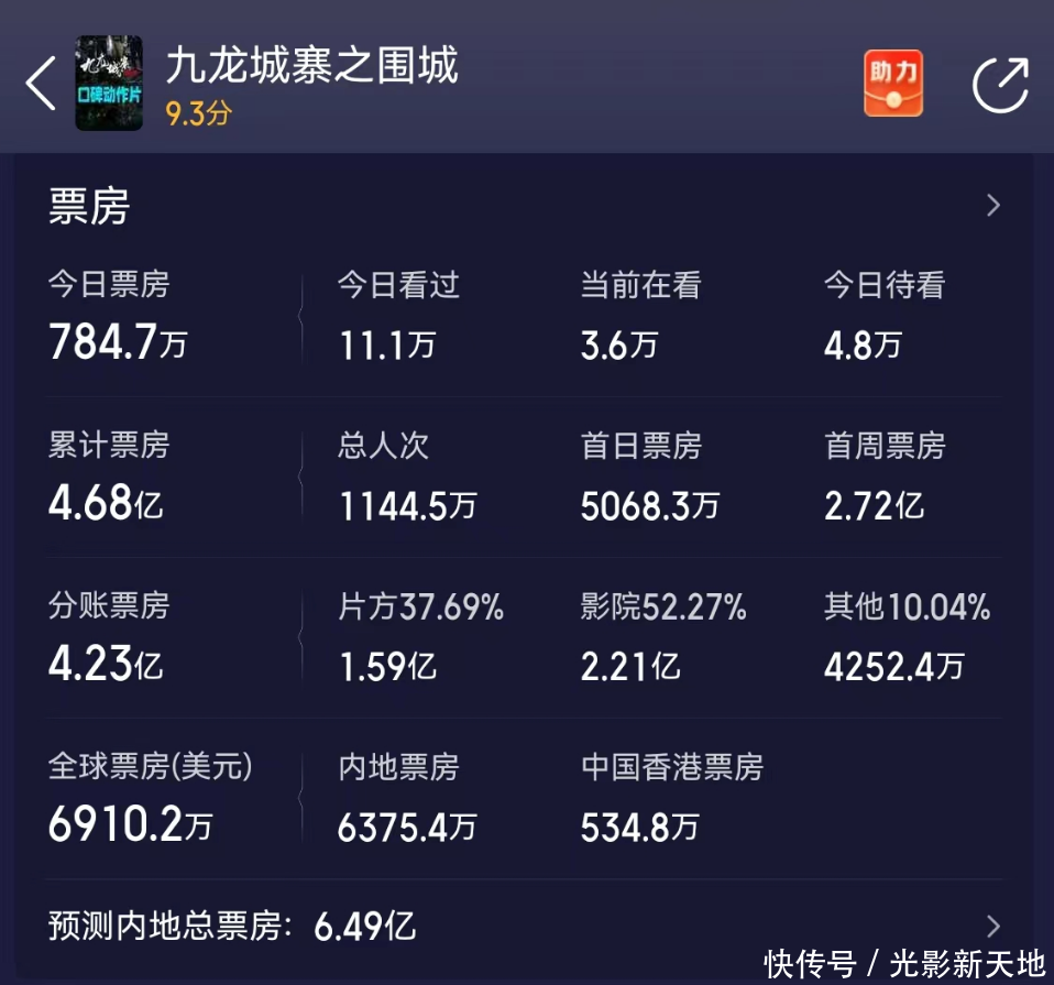 看下数据。电影当今累计票房4.67亿,不外基于好口碑潜力扫数,专科平台给出的总票房展望达到6.49亿。如果按照这个票房筹谋,加上中国香港的3800多万票房,《九龙城寨》的累计票房将有望跳动6.9亿,这样一来,按照37.68%的分账,片方分账票房将达到2.6亿。