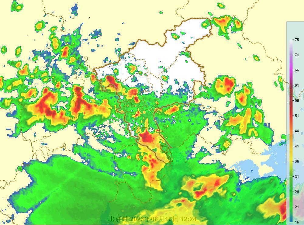 8月18日12时24分的广州雷达图,可见广州多地受强降水影响。广州天气网雷达图